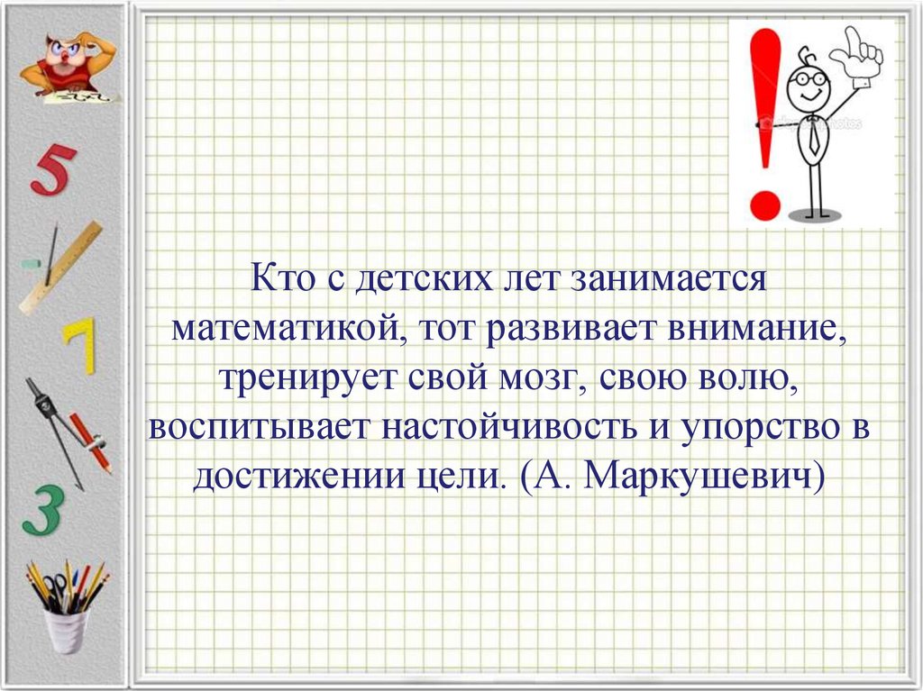 Кто с детских лет занимаетсяматематикой, тот развивает внимание,