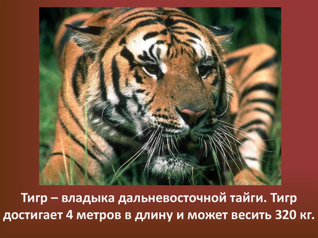 Тигр – владыка дальневосточной тайги. Тигрдостигает 4 метров в длину и может весить 320 кг.