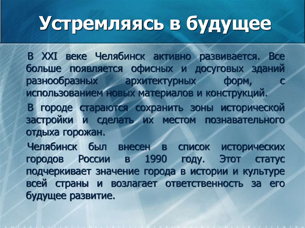 Устремляясь в будущееВ XXI веке Челябинск активно развивается. Все