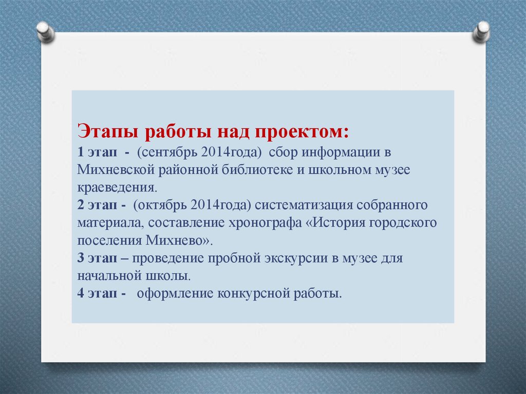 Этапы работы над проектом:1 этап - (сентябрь 2014года) сбор информации в