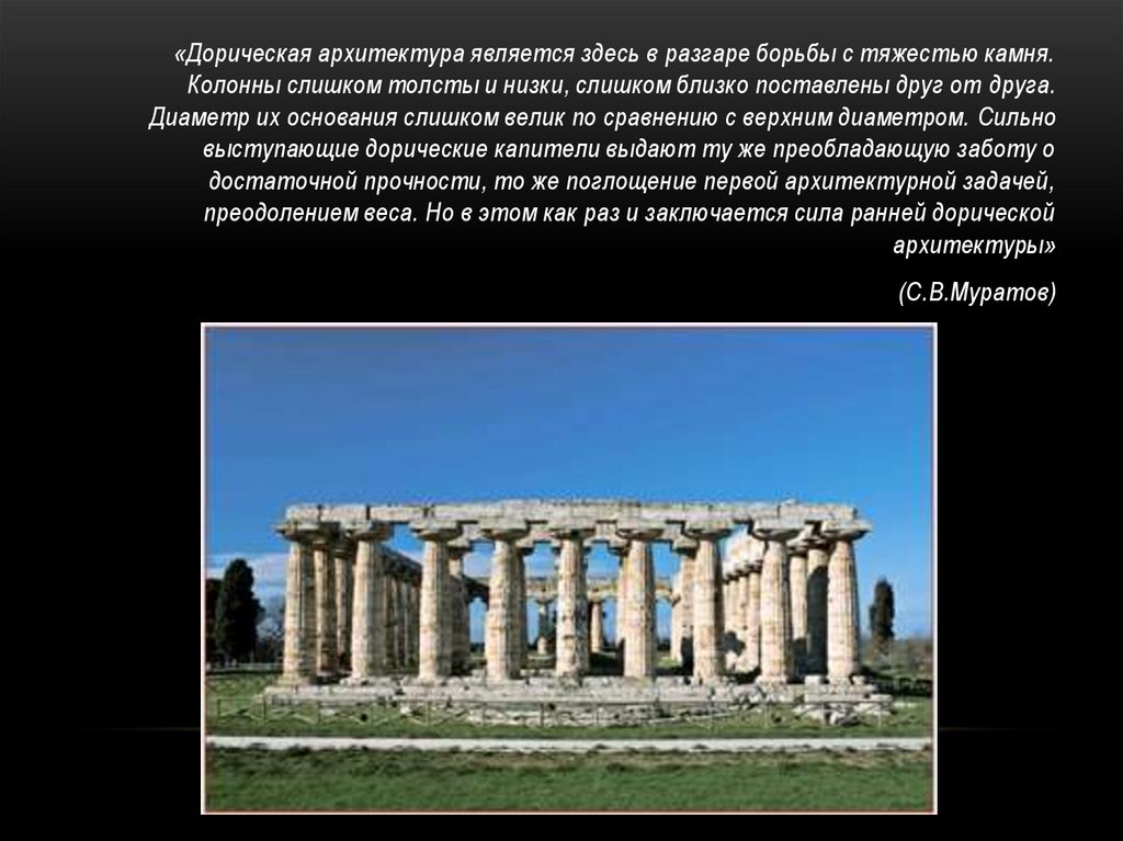 «Дорическая архитектура является здесь в разгаре борьбы с тяжестью камня.Колонны слишком толсты и низки, слишком близко поставлены друг от друга.