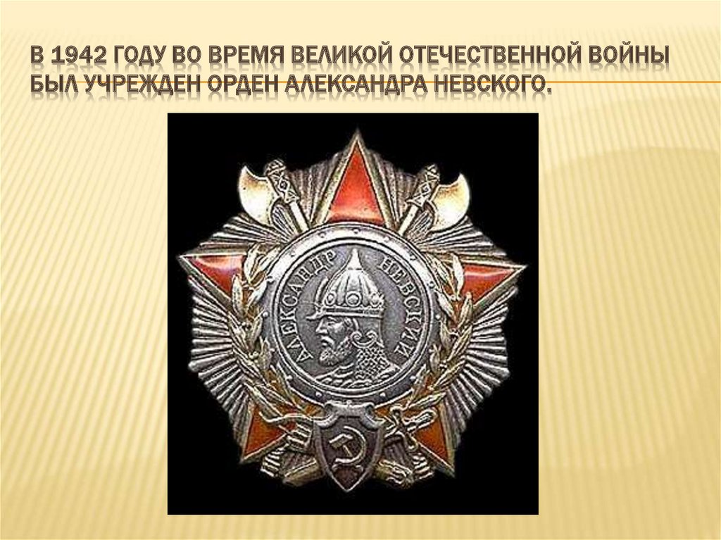 В 1942 ГОДУ ВО ВРЕМЯ ВЕЛИКОЙ ОТЕЧЕСТВЕННОЙ ВОЙНЫБЫЛ УЧРЕЖДЕН ОРДЕН АЛЕКСАНДРА НЕВСКОГО.