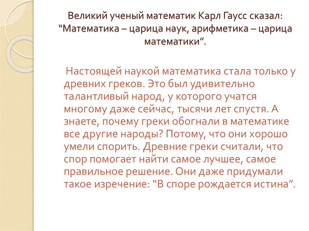 Великий ученый математик Карл Гаусс сказал:“Математика – царица наук, арифметика – царица