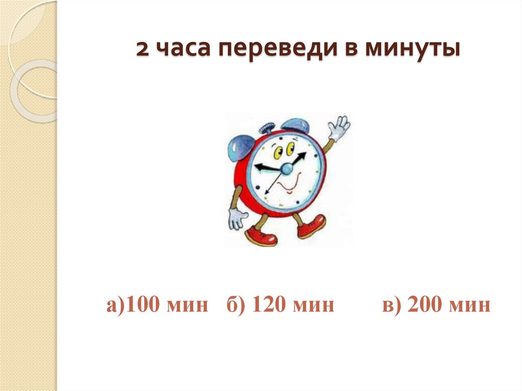 2 часа переведи в минутыа)100 мин б) 120 мин