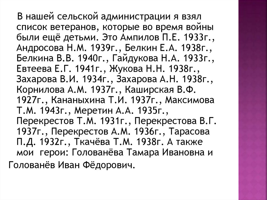 В нашей сельской администрации я взялсписок ветеранов, которые во время войны