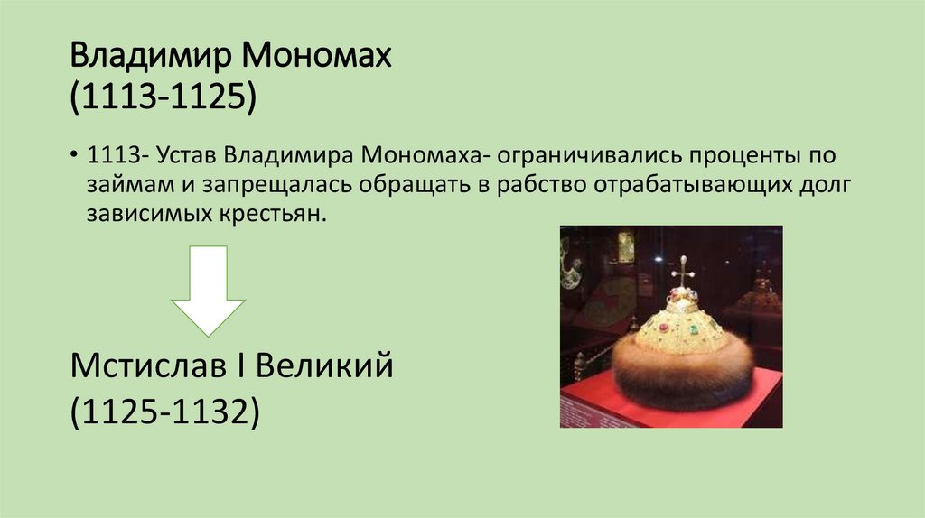 • 1113- Устав Владимира Мономаха- ограничивались проценты по