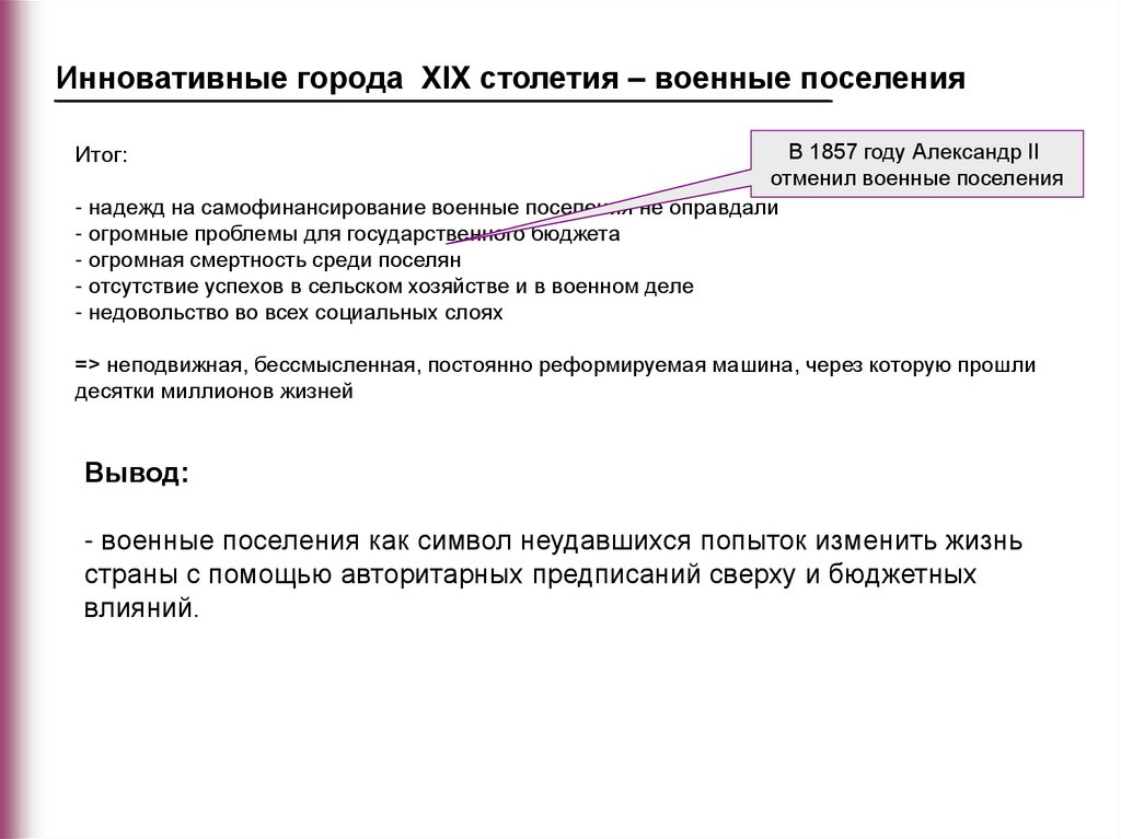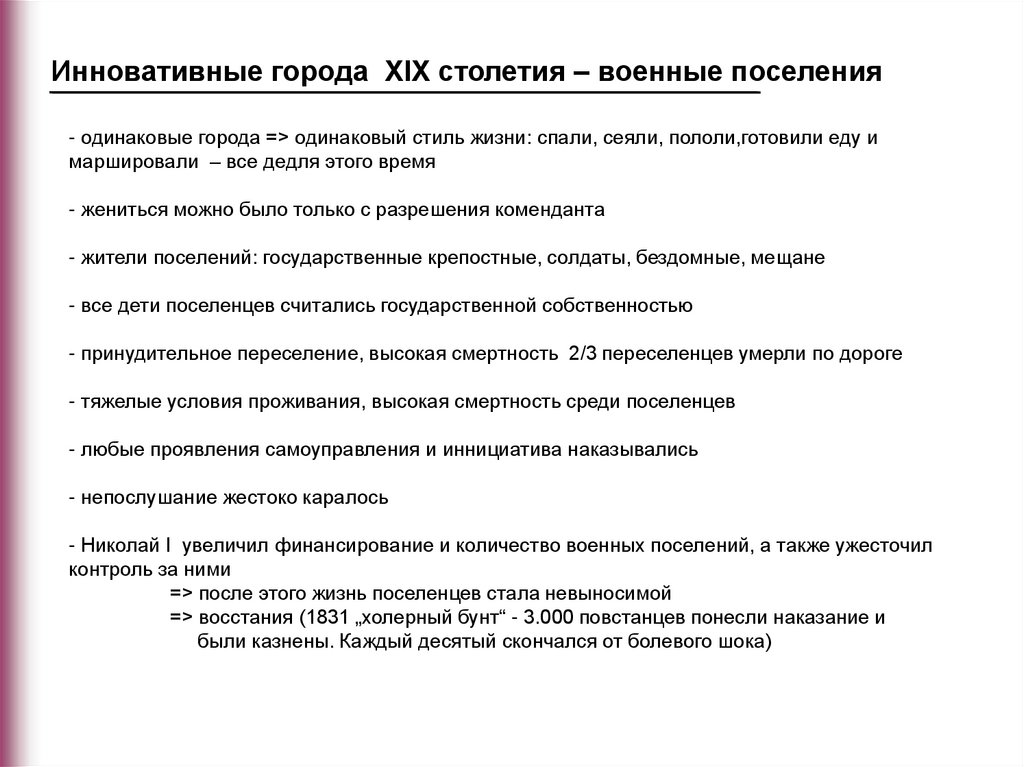 Инновативные города XIX столетия – военные поселения- одинаковые города => одинаковый стиль жизни: спали, сеяли, пололи,готовили еду и