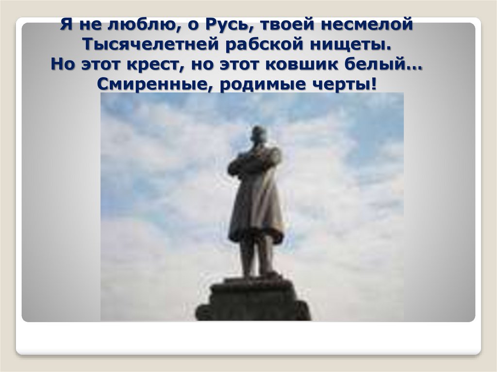 Я не люблю, о Русь, твоей несмелойТысячелетней рабской нищеты.