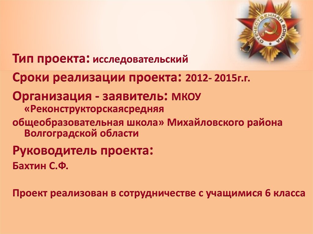 Тип проекта: исследовательскийСроки реализации проекта: 2012- 2015г.г.