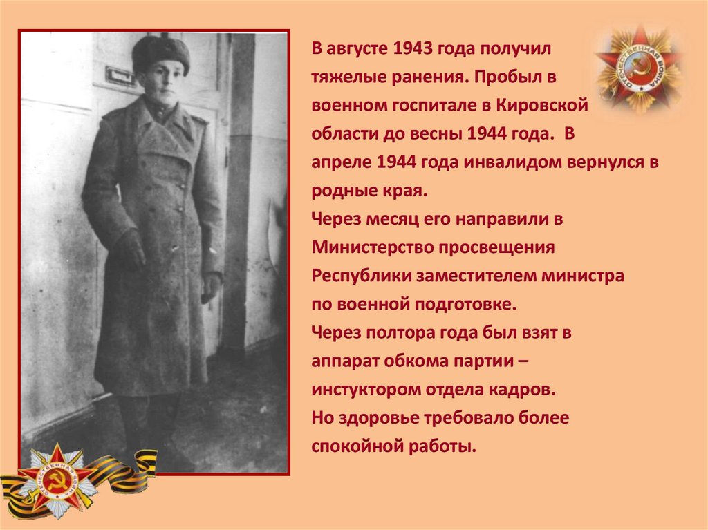 В августе 1943 года получилтяжелые ранения. Пробыл в