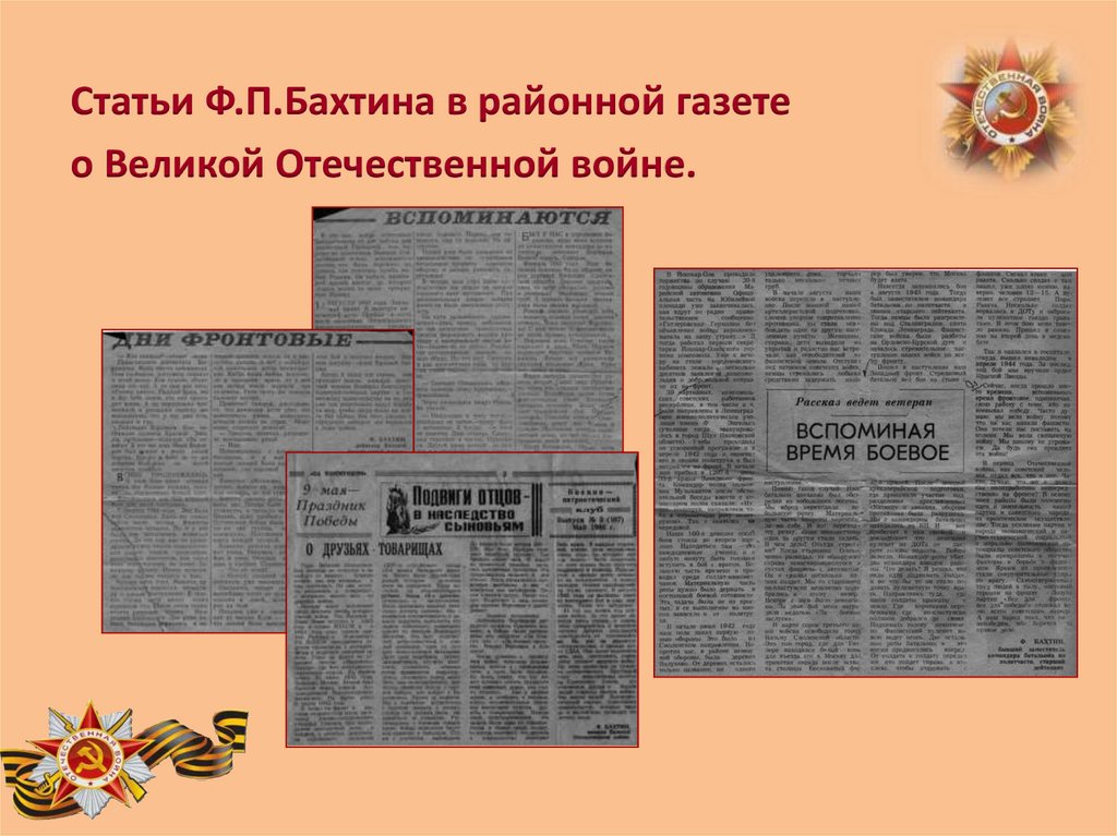 Статьи Ф.П.Бахтина в районной газетео Великой Отечественной войне.