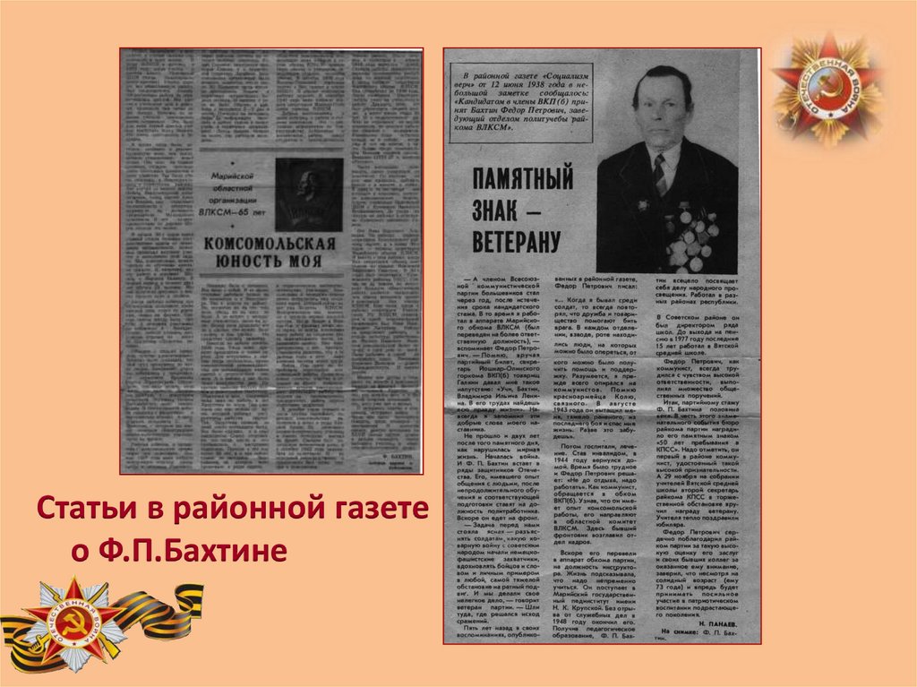 Статьи в районной газетео Ф.П.Бахтине