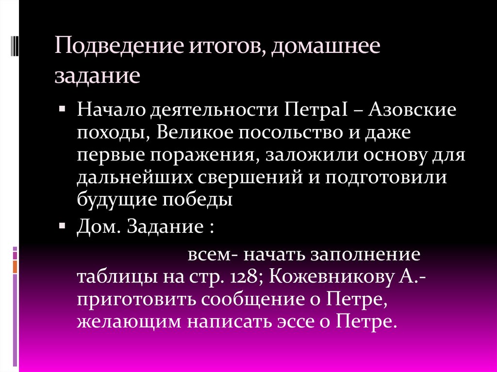 таблицы на стр. 128; Кожевникову А.приготовить сообщение о Петре,