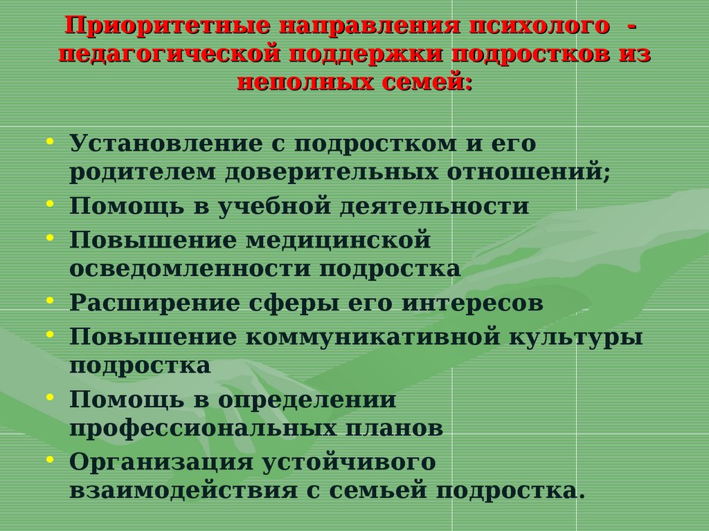 Приоритетные направления психолого педагогической поддержки подростков изнеполных семей: