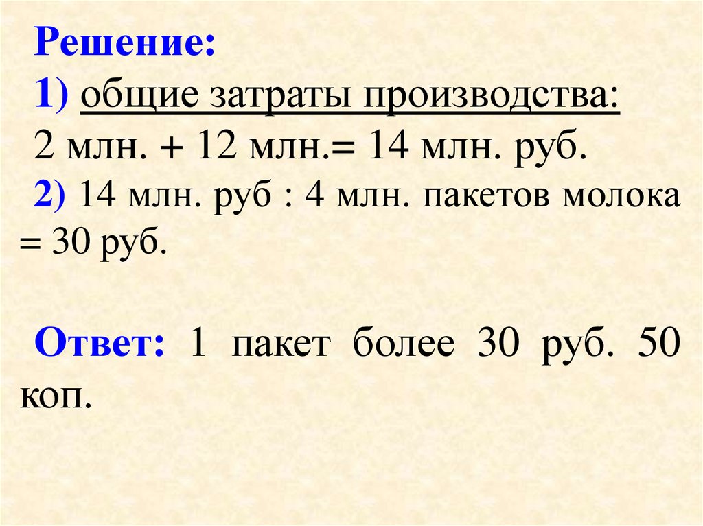 2) 14 млн. руб : 4 млн. пакетов молока