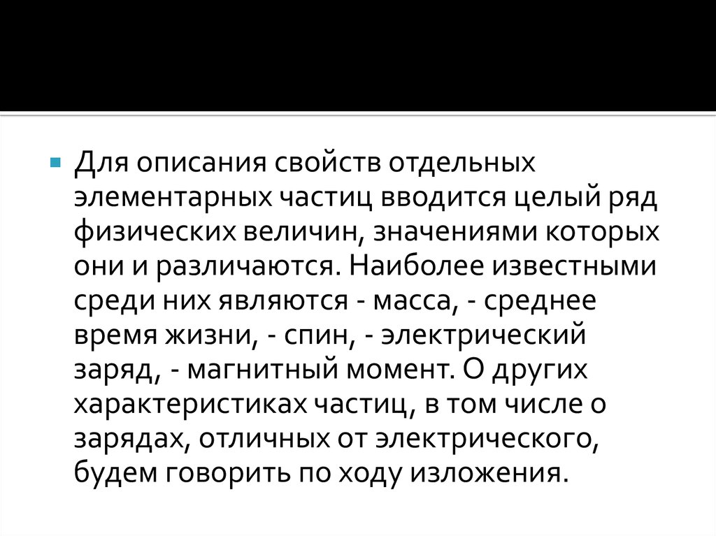 Для описания свойств отдельныхэлементарных частиц вводится целый ряд