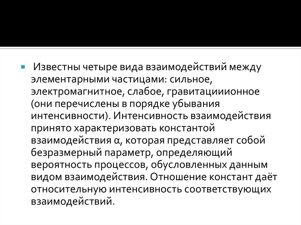 Известны четыре вида взаимодействий междуэлементарными частицами: сильное,