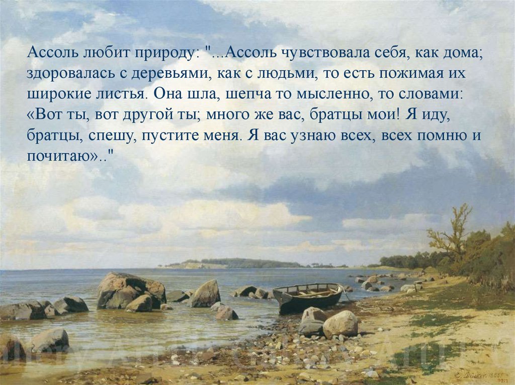 Ассоль любит природу: "...Ассоль чувствовала себя, как дома;здоровалась с деревьями, как с людьми, то есть пожимая их