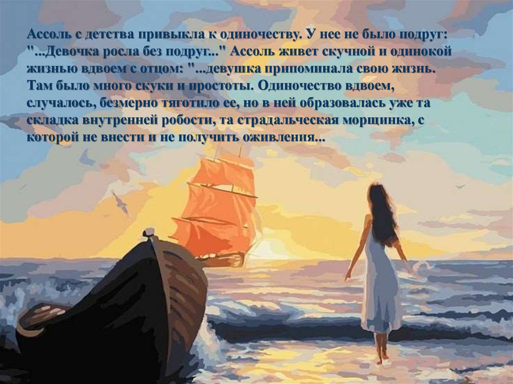 Ассоль с детства привыкла к одиночеству. У нее не было подруг:"...Девочка росла без подруг..." Ассоль живет скучной и одинокой