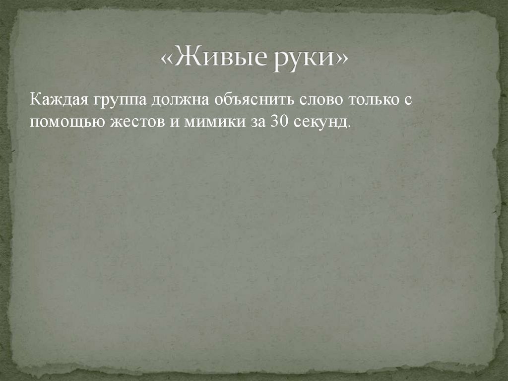 Каждая группа должна объяснить слово только спомощью жестов и мимики за 30 секунд.
