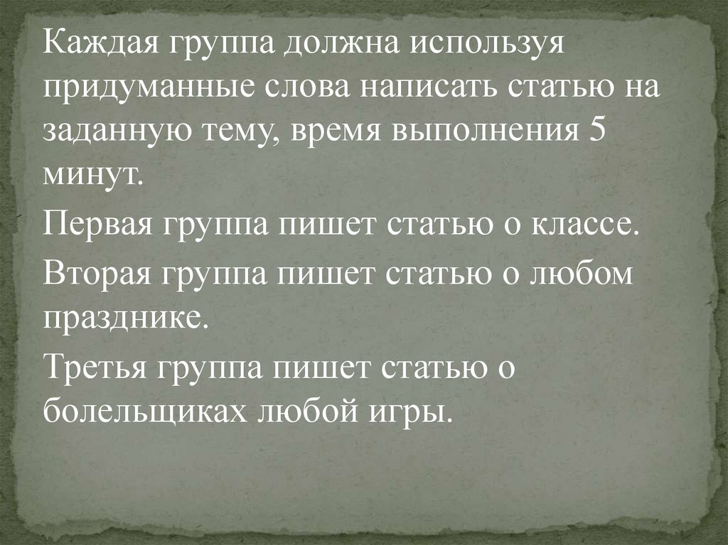 Каждая группа должна используяпридуманные слова написать статью на