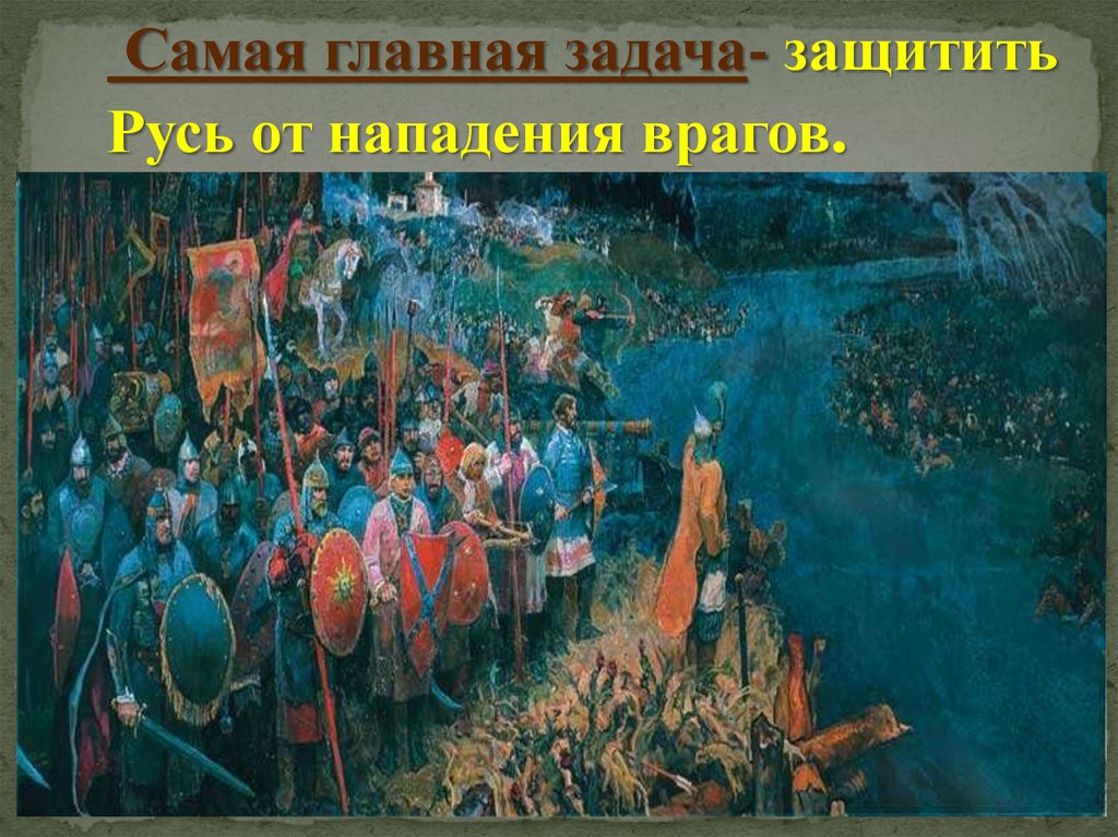 Самая главная задача- защититьРусь от нападения врагов.