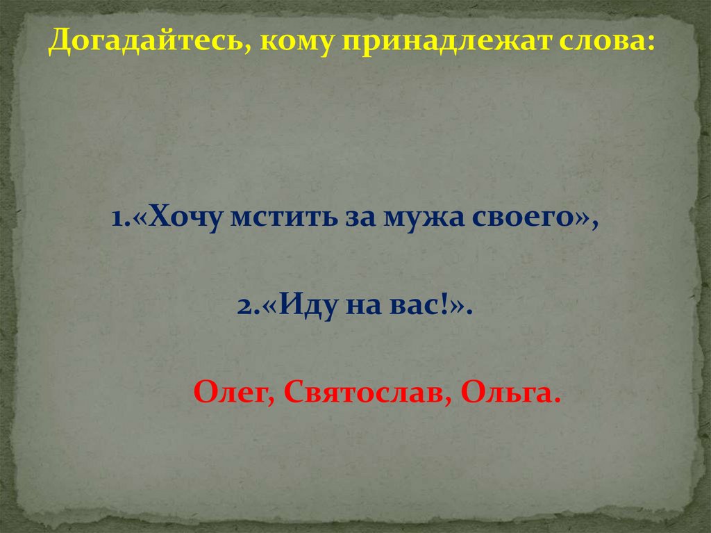 Догадайтесь, кому принадлежат слова:1.«Хочу мстить за мужа своего»,