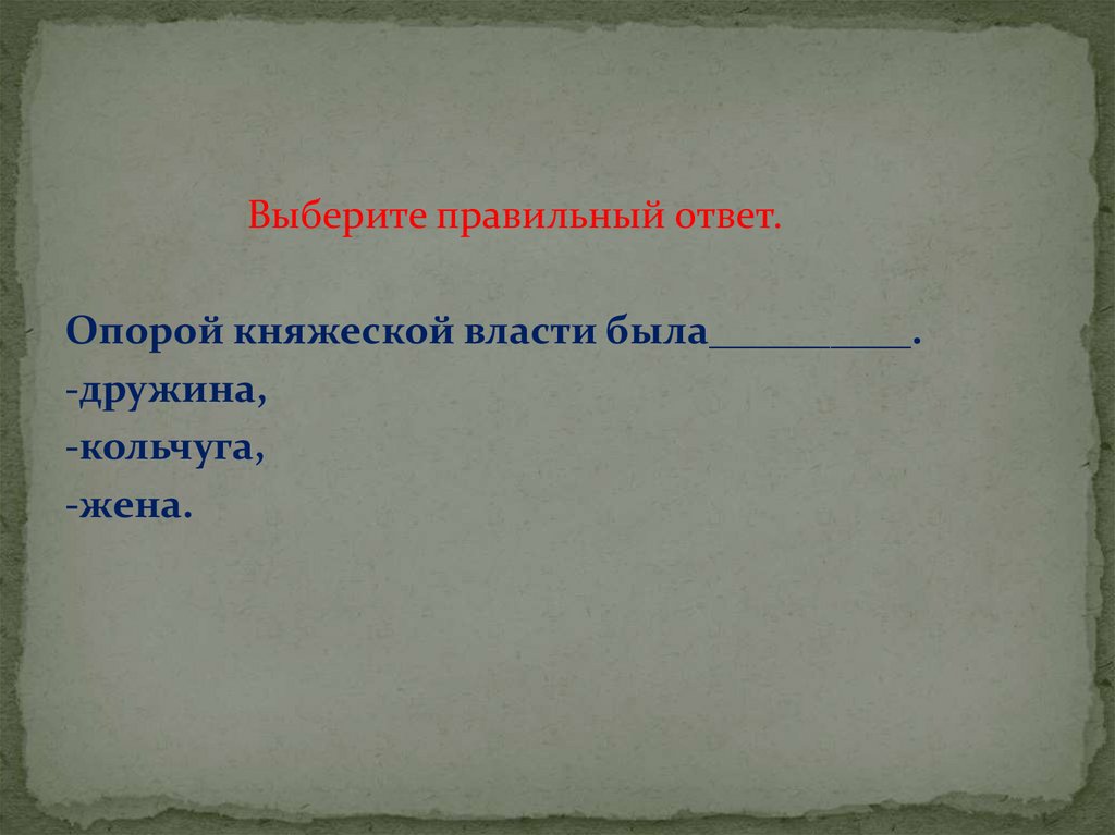 Выберите правильный ответ.Опорой княжеской власти была__________.