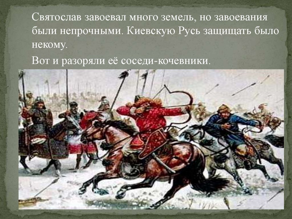 Святослав завоевал много земель, но завоеваниябыли непрочными. Киевскую Русь защищать было
