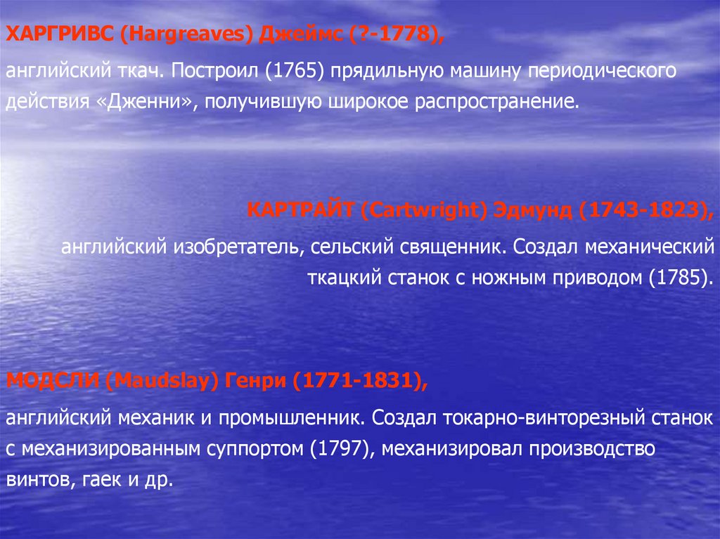 ХАРГРИВС (Hargreaves) Джеймс (?-1778),английский ткач. Построил (1765) прядильную машину периодического