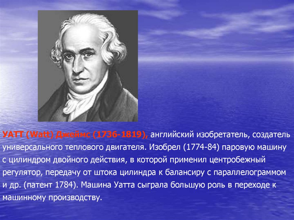 УАТТ (Watt) Джеймс (1736-1819), английский изобретатель, создательуниверсального теплового двигателя. Изобрел (1774-84) паровую машину