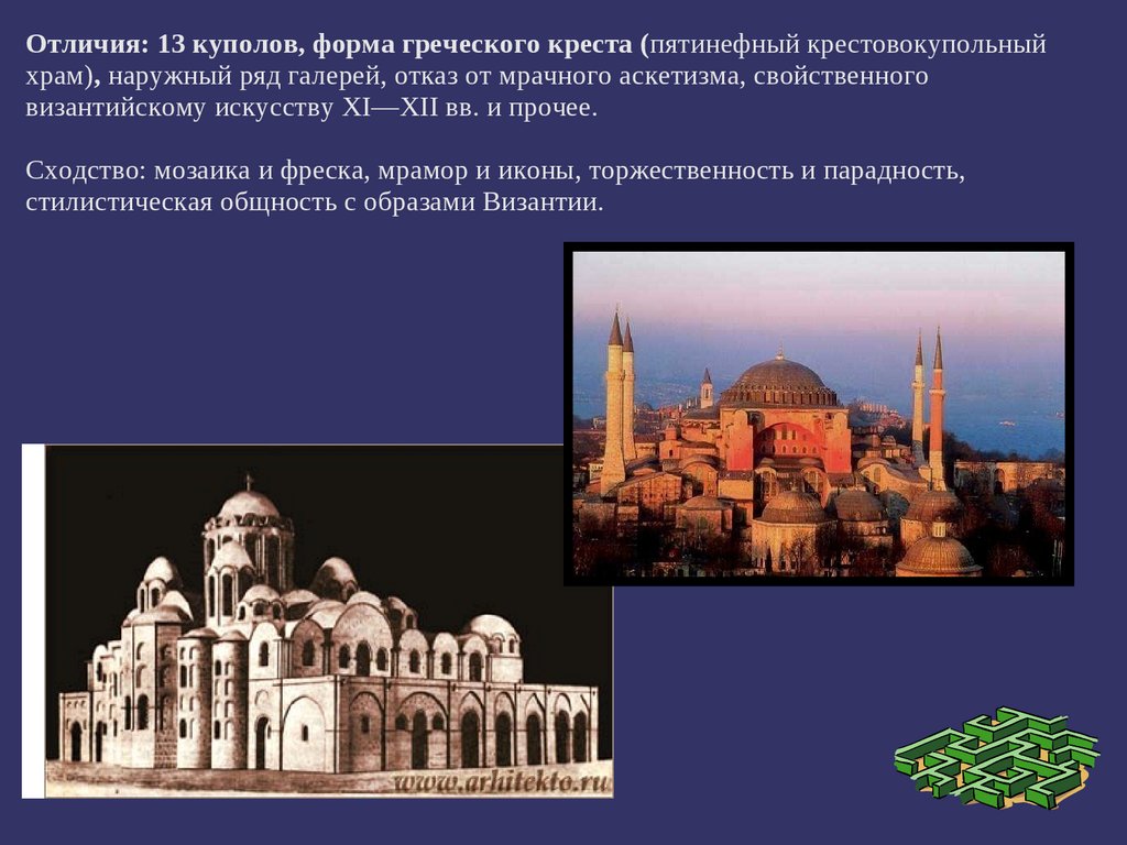 Отличия: 13 куполов, форма греческого креста (пятинефный крестовокупольныйхрам), наружный ряд галерей, отказ от мрачного аскетизма, свойственного