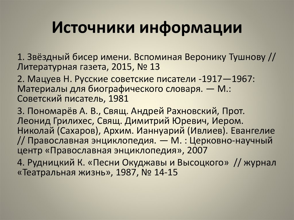 Источники информации1. Звёздный бисер имени. Вспоминая Веронику Тушнову //