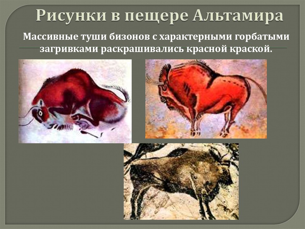 Массивные туши бизонов с характерными горбатымизагривками раскрашивались красной краской.