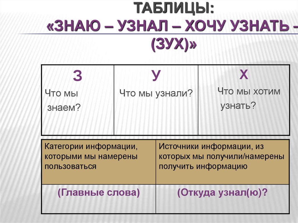 ТАБЛИЦЫ:«ЗНАЮ – УЗНАЛ – ХОЧУ УЗНАТЬ –