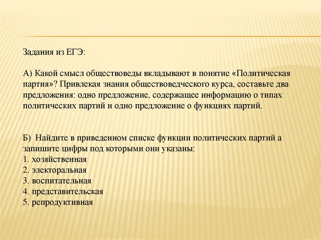 Задания из ЕГЭ:А) Какой смысл обществоведы вкладывают в понятие «Политическая
