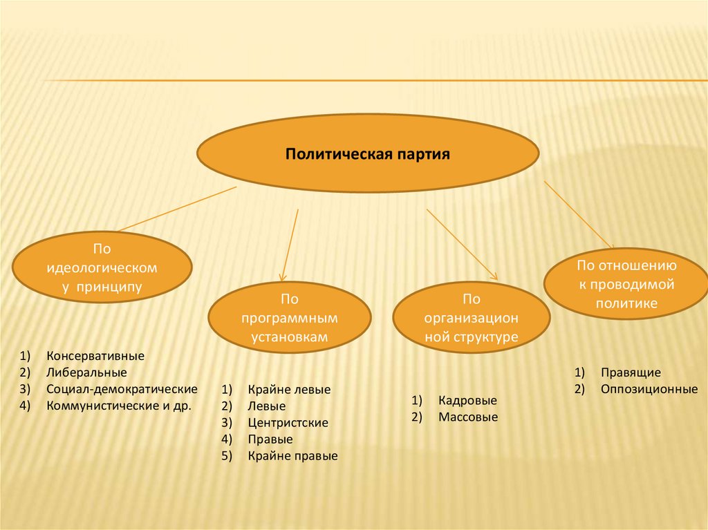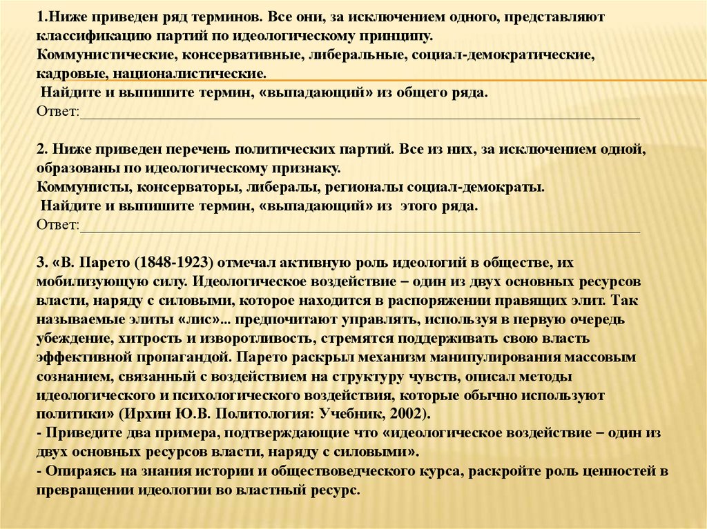 1.Ниже приведен ряд терминов. Все они, за исключением одного, представляютклассификацию партий по идеологическому принципу.