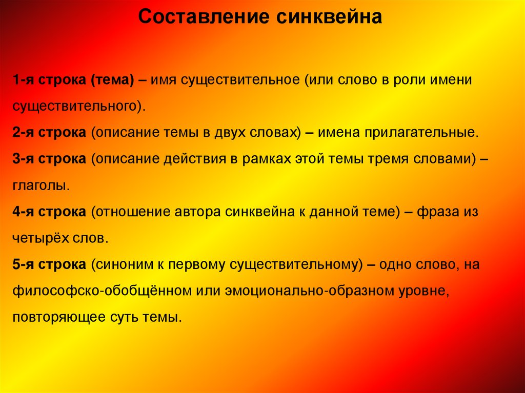 Составление синквейна1-я строка (тема) – имя существительное (или слово в роли имени
