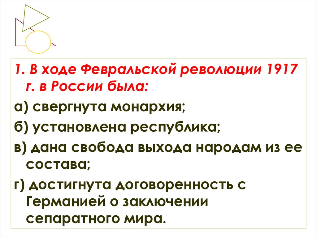 1. В ходе Февральской революции 1917г. в России была: