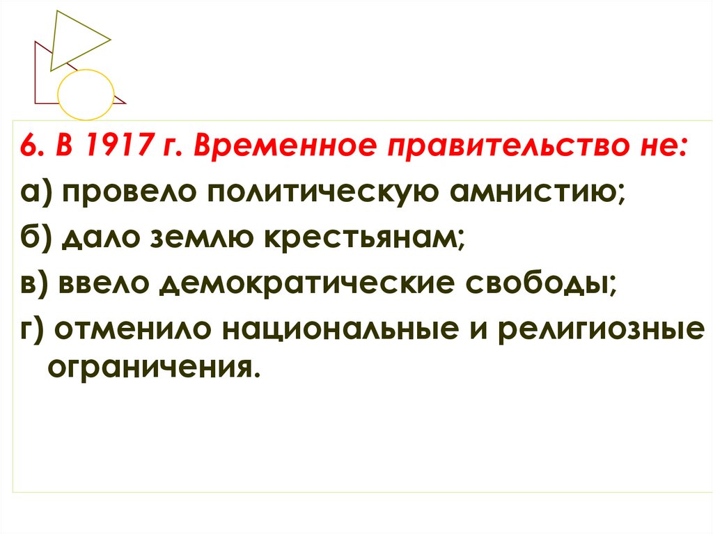 6. В 1917 г. Временное правительство не:а) провело политическую амнистию;