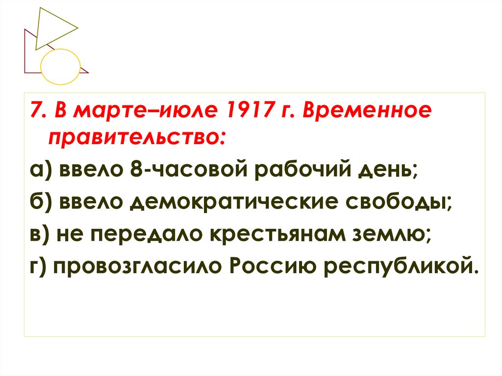 7. В марте–июле 1917 г. Временноеправительство: