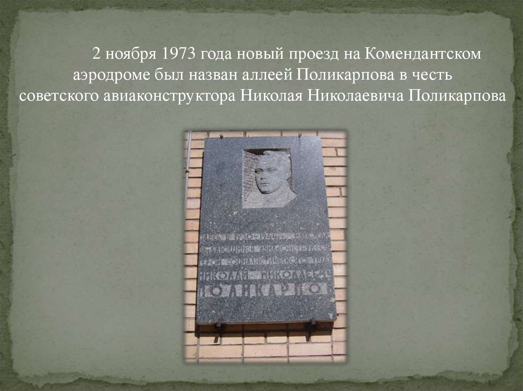 2 ноября 1973 года новый проезд на Комендантскомаэродроме был назван аллеей Поликарпова в честь
