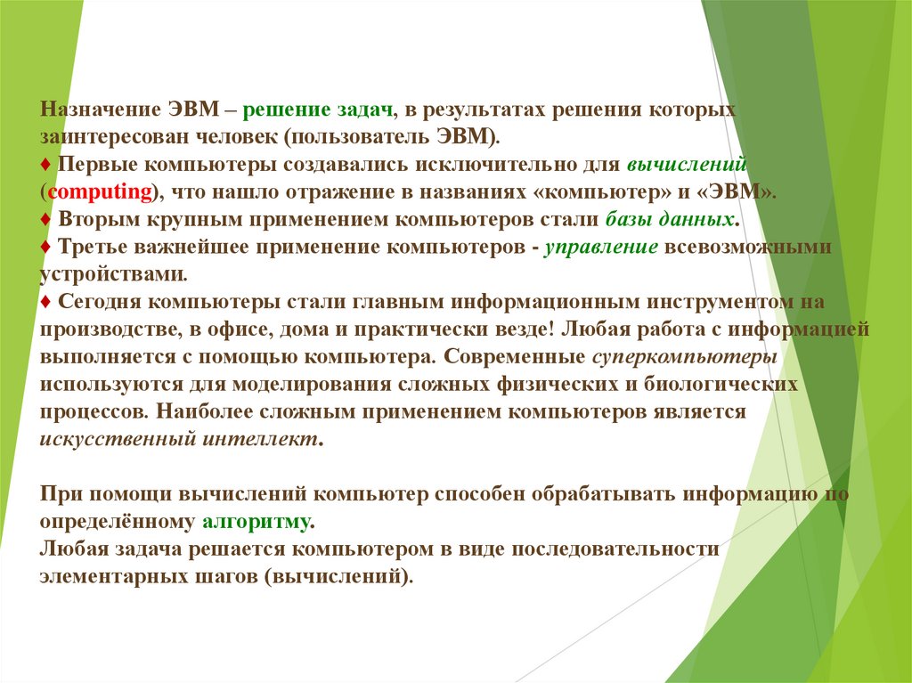 Назначение ЭВМ – решение задач, в результатах решения которыхзаинтересован человек (пользователь ЭВМ).