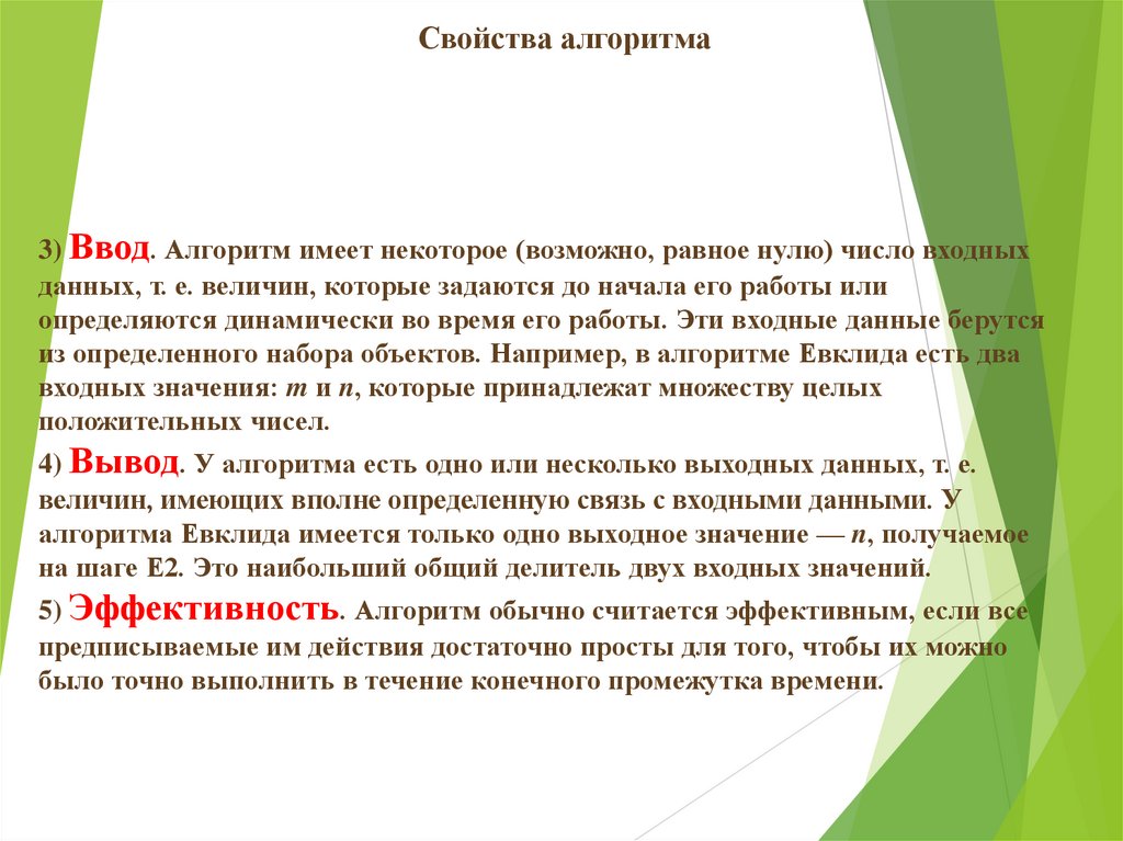 Свойства алгоритма3) Ввод. Алгоритм имеет некоторое (возможно, равное нулю) число входных