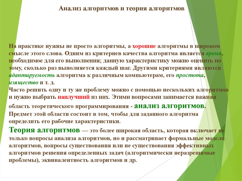 Анализ алгоритмов и теория алгоритмовНа практике нужны не просто алгоритмы, а хорошие алгоритмы в широком