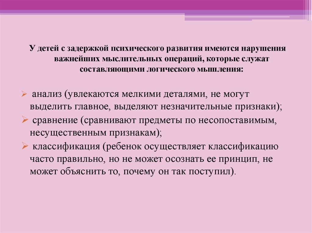У детей с задержкой психического развития имеются нарушенияважнейших мыслительных операций, которые служат