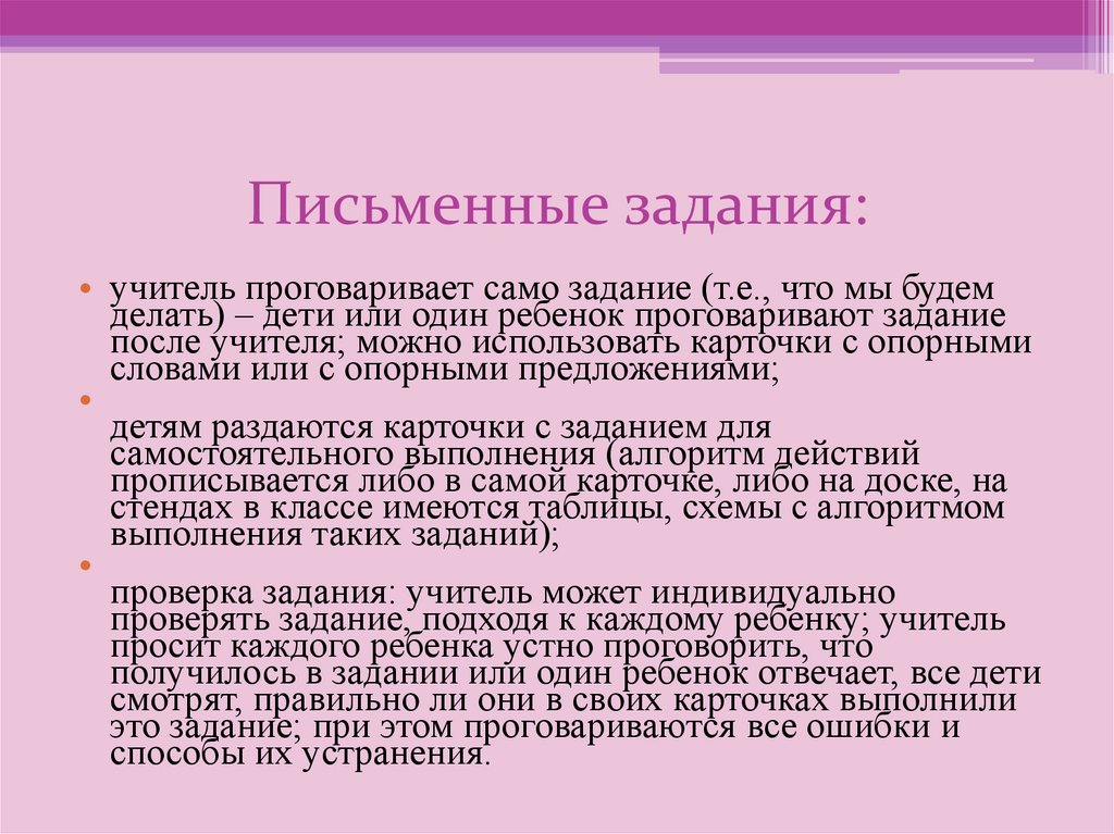 Письменные задания:• учитель проговаривает само задание (т.е., что мы будем