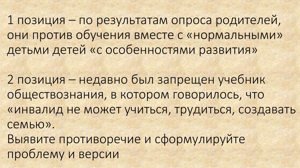 1 позиция – по результатам опроса родителей,они против обучения вместе с «нормальными»
