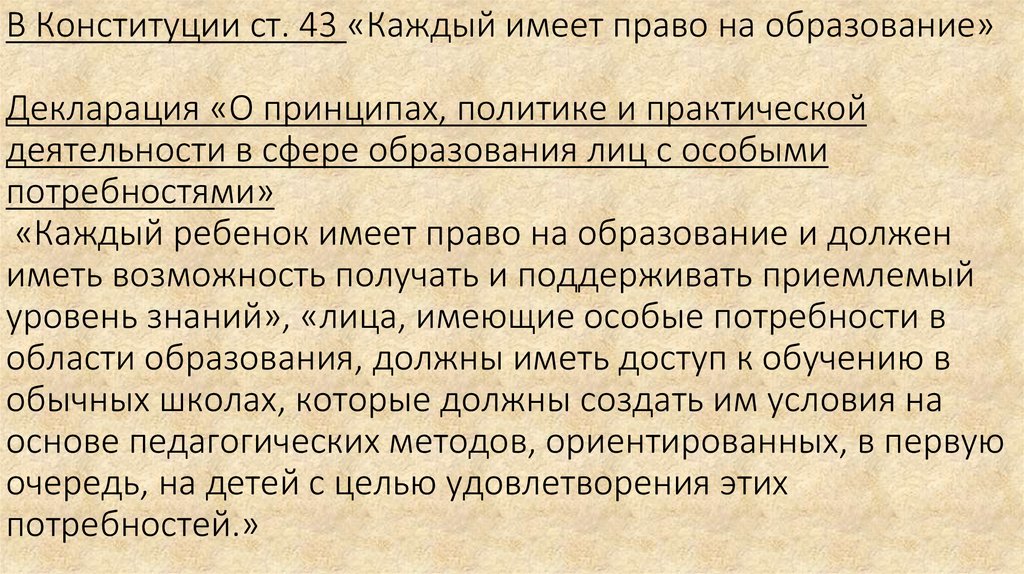 В Конституции ст. 43 «Каждый имеет право на образование»Декларация «О принципах, политике и практической