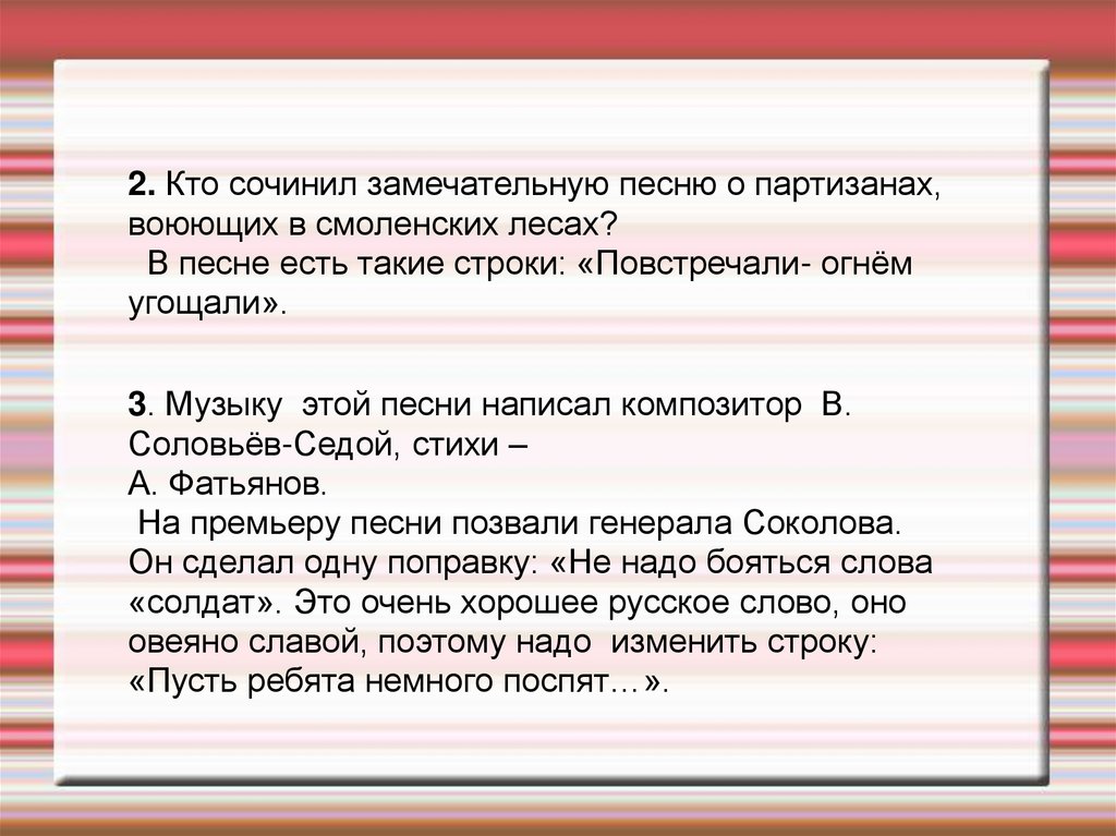 2. Кто сочинил замечательную песню о партизанах,воюющих в смоленских лесах?